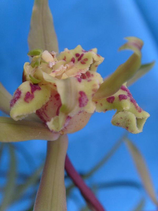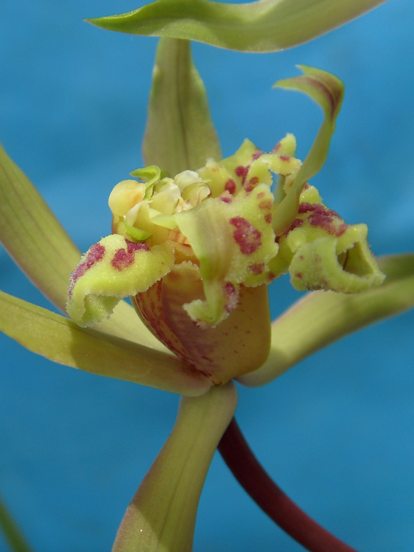 此花外瓣绿黄色,花杆赤转绿。多舌,有时5-7个舌片(壮苗时会开出8-10个舌头),均衡排列在变异了的鼻柱周围,鼻柱融化。该品种十分珍稀,是蕙兰类不可多得的新品牡丹。收藏、鉴赏及投资都是兰友较为理想的选择。至今40苗左右。 |